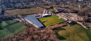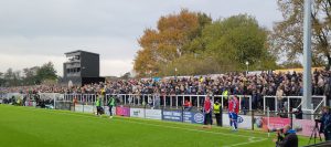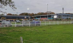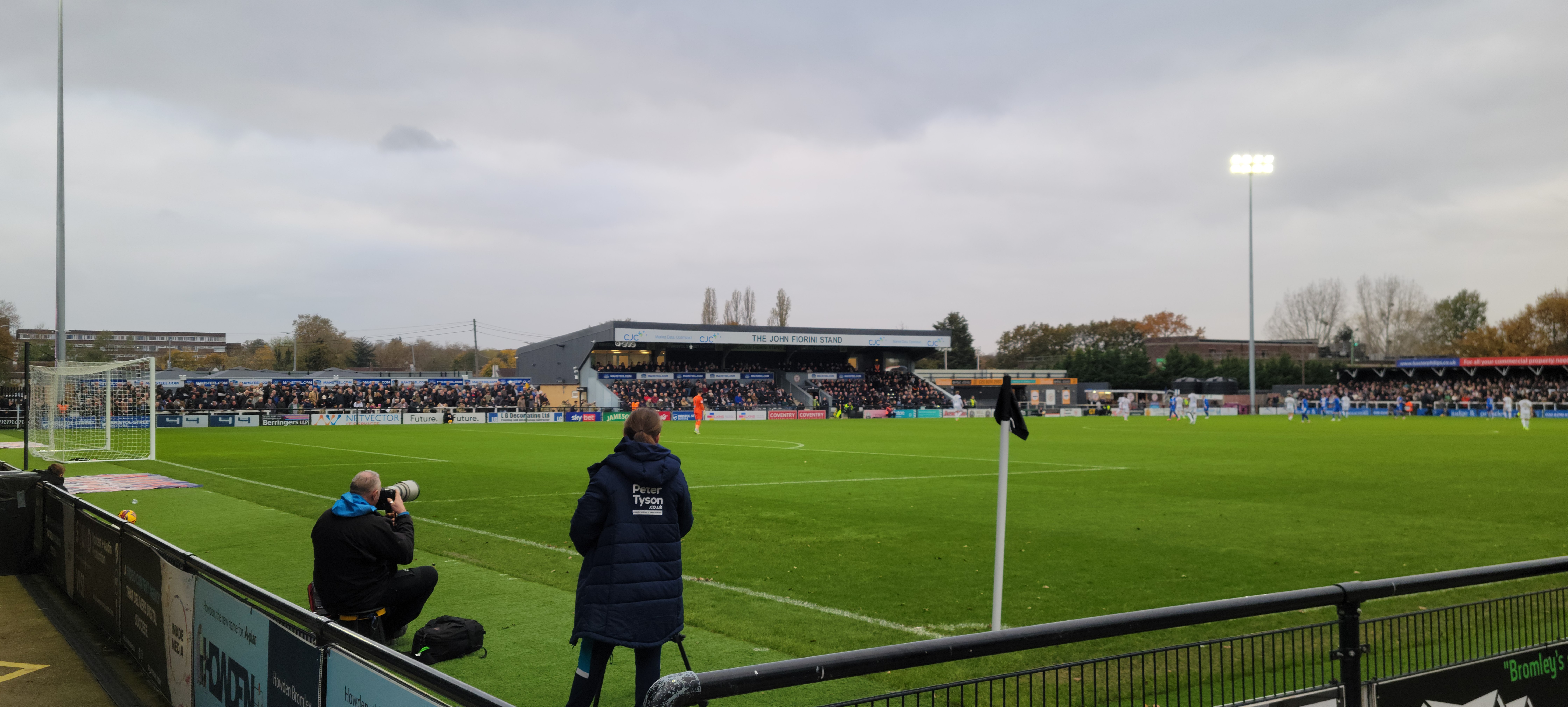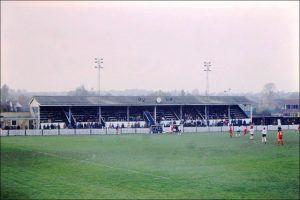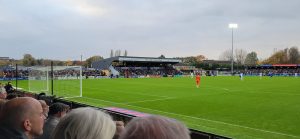 Both ends acquired incongruous blocks of plastic seats following promotion to the National League. Those opposite us – huddled under natty, gymkhana-style canvas -once catered for swimming enthusiasts at the 2012 London Olympics. Such measures were necessary because the burned stand’s squatly modern replacement only caters for a mere few hundred spectators.