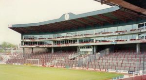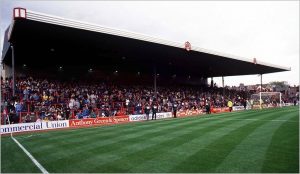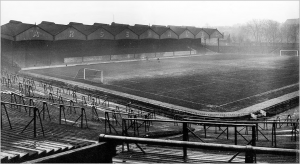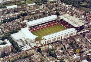 Chapman’s clock occupied a gantry opposite. This banking therefore became known as the Clock End. It never lost Leitch’s original 1913 profile, although some incongruous corporate boxes eventually provided partial – if incidental – cover for fans standing underneath. Because access was only possible from Avenell Road Hghbury enforced strict segregation much later than many other grounds.